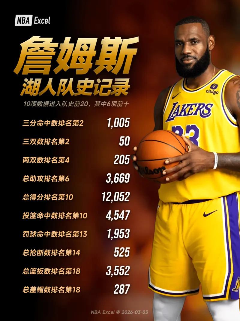 PG电子最新官网-詹姆斯湖人队史记录:10项数据进入队史前20,其中6项前十