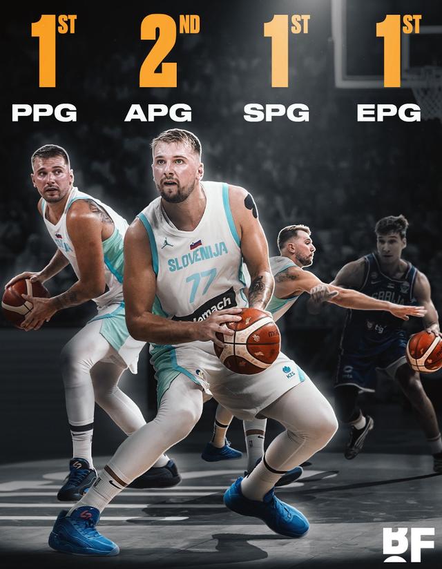 东契奇五场小组赛场均33.4分钟,拿到32.4分8篮板8.4助攻3.2抢断0.8盖帽,命中率44%,三分命中率29.4%,效率值35.4。得分、抢断、效率值都是小组赛第一的存在,值得一提的是助攻也是第二。